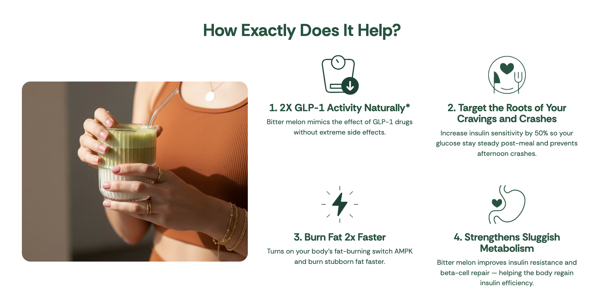 Each blend is formulated to gently nudge the pathways that drive appetite, cravings, and fat-burning — including natural GLP-1 activation from bitter melon — so your metabolism feels responsive instead of sluggish.